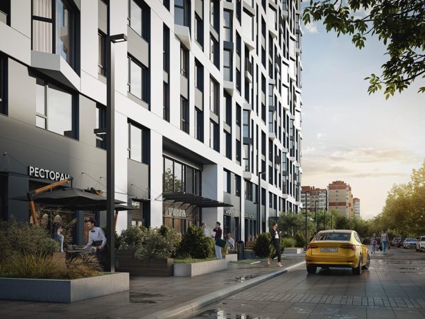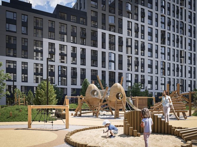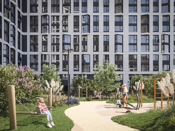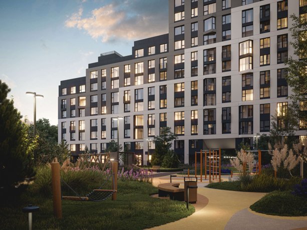 Территория жилого комплекса имеет отдельный выход в парк и разделена функциональными зонами, где каждый сможет найти себе занятие по душе: детские и игровые площадки из натурального дерева, зоны отдыха и спорта, кофейня внутри двора.